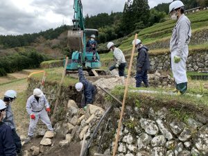 約400年の歴史を有する「坂折棚田」の石積みの中で、痛んでいる箇所を崩し、新たに積み直しをします。